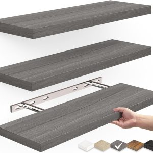 Floating Shelves, Wall Mounted Rustic Wood Shelves for Bathroom, Bedroom, Living Room Decor with 22lbs Capacity (Grey, Set of 3, 16in)